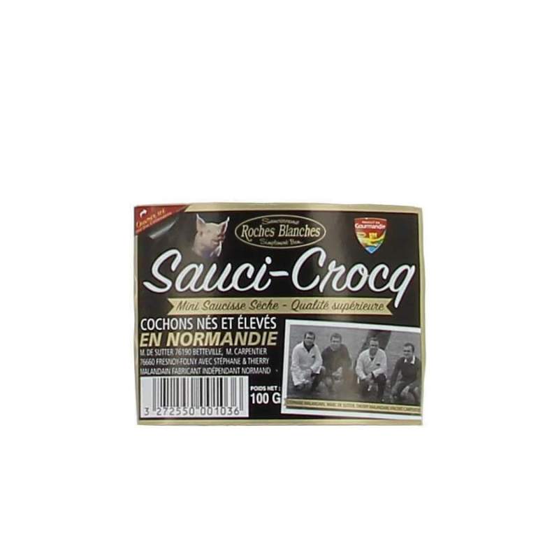 La saucicroq est réalisée par les Roches Blanches une entreprise familiale située à Cany tout près d’Etretat en Normandie. Cette mini-saucisse sèche pure porc a été conçue spécialement pour déguster et partager lors d’un apéritif.