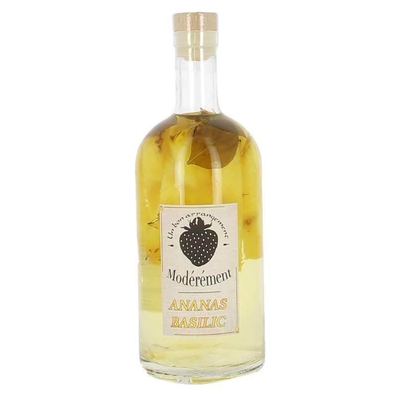 Le Rhum arrangé ananas basilic d'un bon Arrangement de la gamme Modérement est une macération de Rhum AOC de Martinique avec des tranches d'ananas Victoria et du basilic de l'Eure.