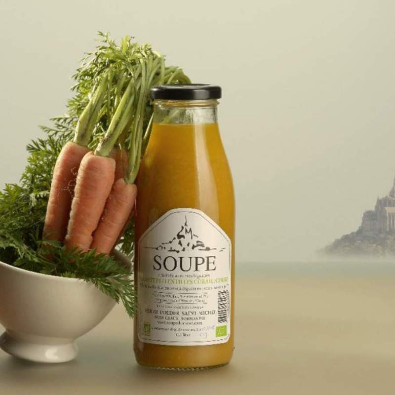 Ingrédients : Carottes 34%, Lentilles corail 7%,Oignon, Curry, Huile d’olive, Sel, Eau.
