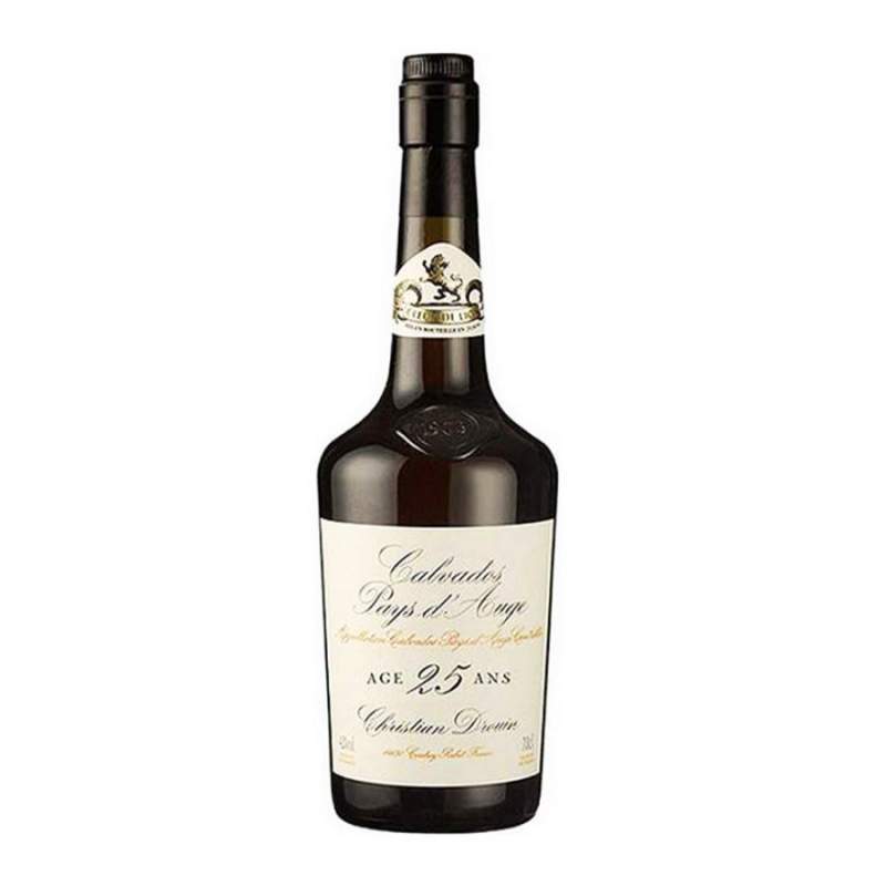 Un vieux Calvados de 25 ans d'âge produit par la famille Drouin sous l'appellation Calvados Pays d'Auge.