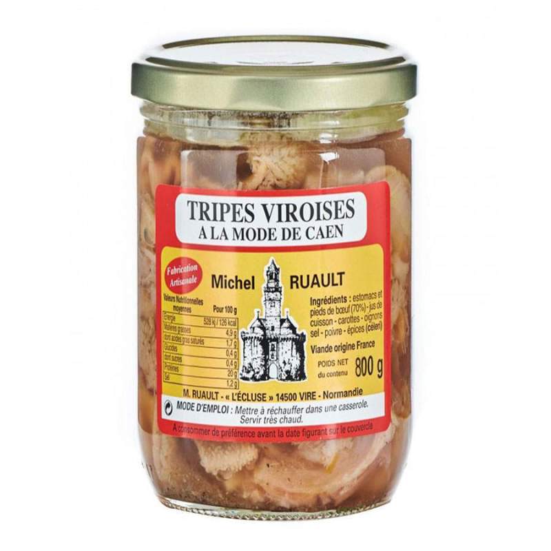 Les tripes à la mode de Caen 800g des tripes Viroises sont fabriquées artisanalement par Michel Ruault. La recette de la tripes à la mode de Caen est réalisée sans superflu, les ingrédients de la recette traditionnelle sont tous présent. Le savoir faire de Michel Ruault fait la différence.