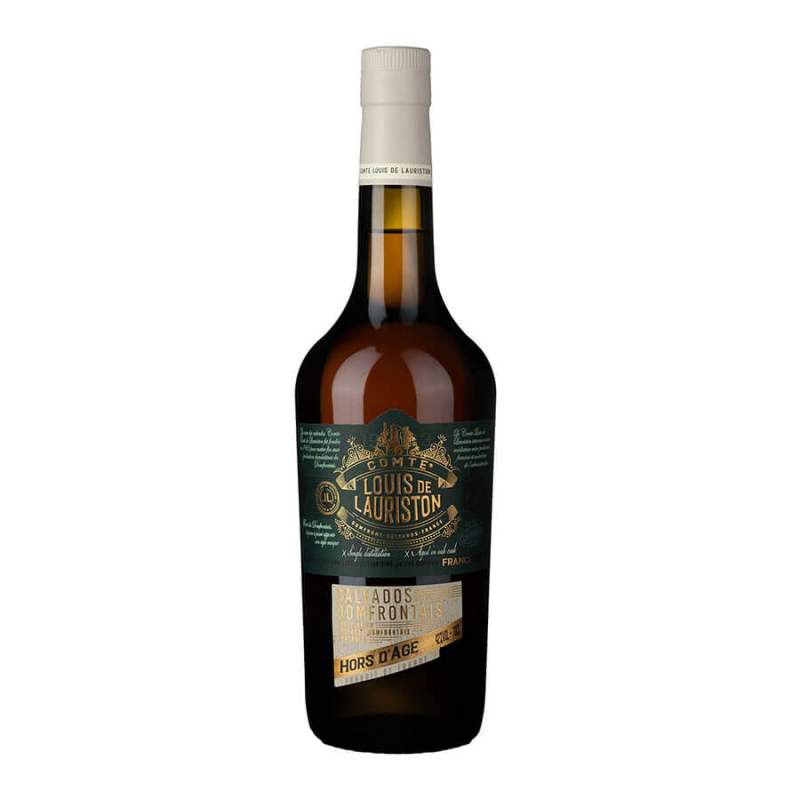 Cet AOC Calvados Domfrontais est vieilli 15 ans en fût de chêne par le producteur normand Compte Louis de Lauriston. Ce Calvados Hors d'âge a un taux d'alcool de 42%.